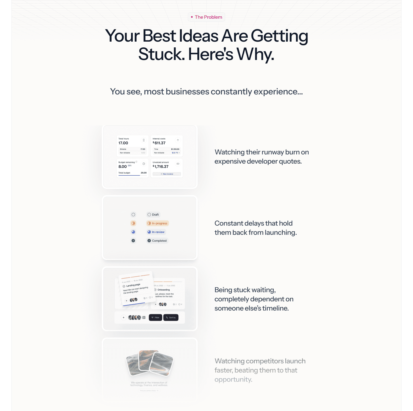 Build a conversion system that scales your SaaS: optimized sites, strategic copy, reliable backends, high-converting ads... all tailored to your specific stage, not a one-size-fits-all template.